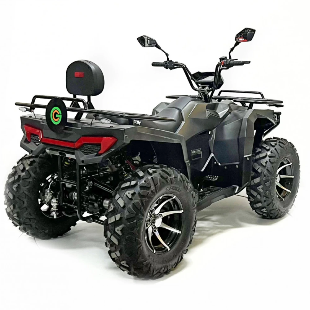Двигатель квадроцикла – это высокоэффективный PMSM мотор мощностью 10 кВт, который обеспечивает динамичное ускорение и плавное распределение мощности. Максимальная скорость достигает 70 км/ч, что позволяет уверенно передвигаться как по проселочным дорогам, так и по легкому бездорожью, а максимальная нагрузка в 200 кг открывает широкие возможности для перевозки пассажиров и грузов. Дополнительные опции, такие как фаркоп и лебедка, значительно расширяют функциональные возможности транспортного средства, делая его незаменимым помощником в самых разнообразных ситуациях.