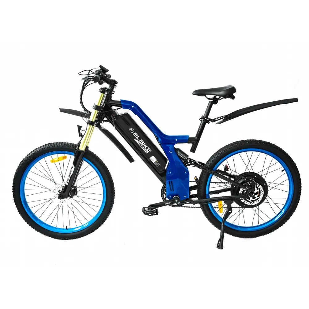 Электровелосипед Elbike TURBO R65 премиум класса представлен в благородном синем цвете. Мощный мотор 500 Вт, большой размер колёс в 26 дюймов, электровелосипед разгоняется до 40 км/ч.