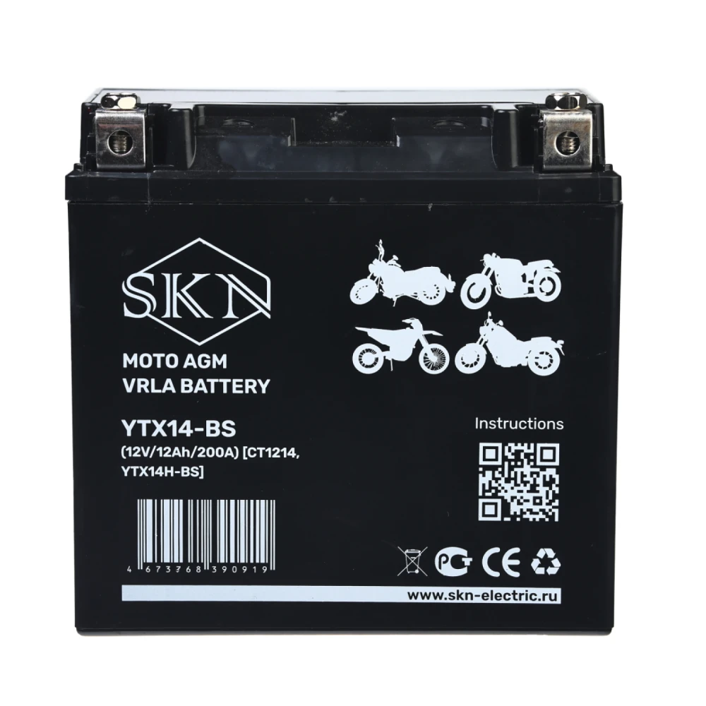 Аккумулятор стартерный для мототехники SKN YTX14L-BS (12V/12Ah/200А) [CT1214, YB14L-A2]