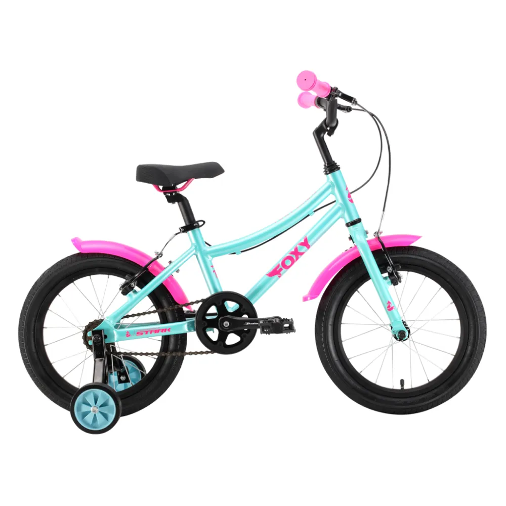 Велосипед Stark'22 Foxy Girl 16 бирюзовый/розовый также оснащен двумя детскими колесиками, которые обеспечивают стабильность и помогают начинающим велосипедисткам освоить навыки езды.